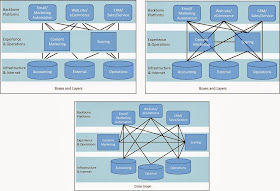 Scott never claimed that his diagram illustrates a precise relationship among the components, so it's no criticism to point out that it doesn't. Experience and Operations systems sometimes connect with Backbone Platforms through a Middleware system, but more often they connect with the Backbone Platforms directly. In fact, some of the Experience and Operations systems connect with multiple Platforms, serving as sort of do-it-yourself Middleware. The challenge of illustrating this becomes clear when you try adding lines to show how the classes of systems interact with each other – it’s not as simple as connecting the adjacent layers on Scott’s diagram.